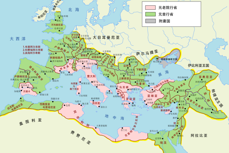 屋大维很慷慨,分给元老院的行省都是帝国最安定的地盘儿,比如意大利本土、希腊、北非这些没有外敌威胁的地方。