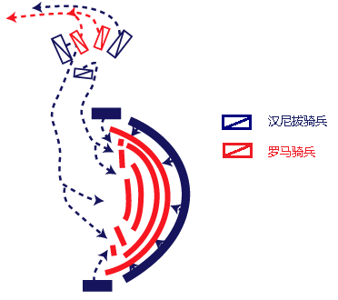 而此时,步兵也基本完成了新月阵,把对手兜住了,于是,骑兵掉头冲击对手后背,从后面夹击罗马步兵,完成了合围。