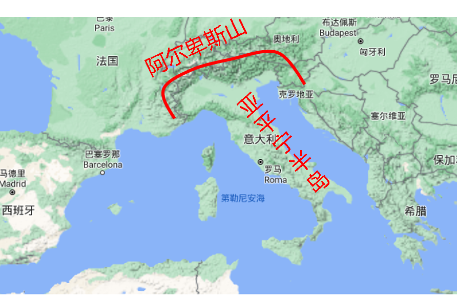 罗马所在的半岛叫亚平宁半岛,在半岛的北面,有著名的阿尔卑斯山,平均海拔3000米,终年积雪,极难翻越。