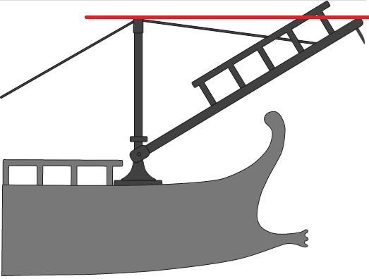 这是一种装在船上的吊桥,当两船接舷后,能降下来勾住对方,于是,士兵就能踩着吊桥登船,与敌人近身肉搏。