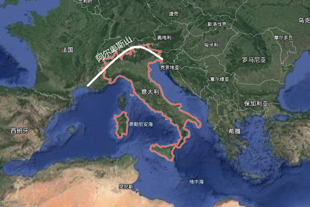 意大利是个半岛,三面环海,北面还有高耸的阿尔卑斯山,把他与欧洲大陆分割开,只留下狭窄的海岸通到法国。