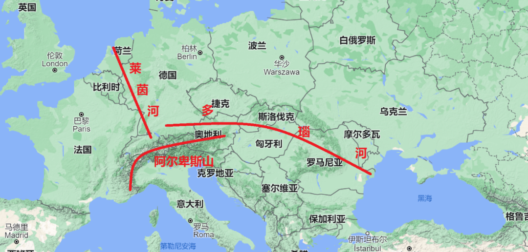 其中,莱茵河发源于西段山脉,然后自南向北流入大西洋,所以守住莱茵河只能保证西段阿尔卑斯山防线的安全,对东段就鞭长莫及了。