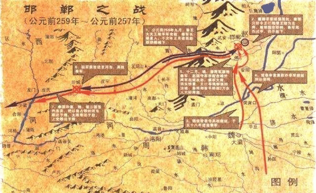 周赧王五十六年(前259年)到周赧王五十八年(前257年),秦国进军赵国都城邯郸,发动邯郸之战。由于赵国军民抵抗意志十分顽强,再加上魏国信陵君、楚国春申君率领援军赶到,将围攻邯郸的秦军包了饺子,秦军大败,伤亡近30万。赵魏楚韩四国联军收复了河东郡、上党郡、太原郡,秦军收缩回河西郡。