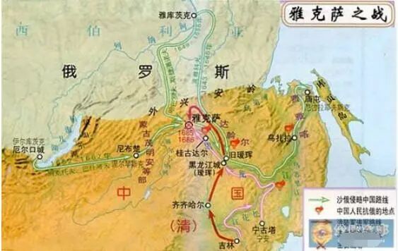雅克萨位于黑龙江省漠河县以东黑龙江北岸(今俄罗斯阿尔巴金诺),但在历史上是中国东北边疆古城。17世纪,沙俄由于国力迅速增强,急剧向外扩张,侵占了中国领土尼布楚和雅克萨等地,并在那里构筑寨堡,设置工事。