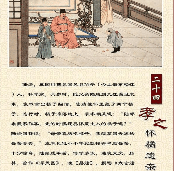 《二十四孝》里记载了很多的体现孝道的故事,有帝王如汉文帝刘恒,也有被后人诟病的“郭巨埋儿”。其中有一个故事大家可能也听过,就是陆绩怀橘遗亲。这个主人公陆绩因这个故事而被人所知,但是他却英年早逝,不过他留下的一句话让我们今天的后人看起来竟然十分惊讶,他对统一的事情竟然有如此精准的预测。