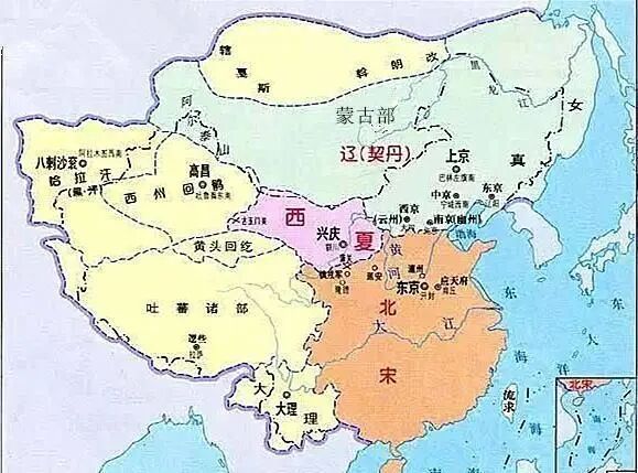 宝元元年(1038年),党项人李元昊建立夏国,北宋称之为西夏(1038年——1227年)。西夏在与当时的辽与北宋的互相攻伐中并没有吃亏,形成当时辽(916年——1125年)、北宋(960年——1127年)、西夏三足鼎立的局面。金国的崛起却改变了中国历史上这一三国鼎立的局面,生活在中国东北黑土地上的女真完颜部在其首领完颜阿骨打的领导下统一了女真各部,统一各部后,在(1115年),他于会宁府(今黑龙江省哈尔滨市阿城区)建都立国,国号大金。金朝建国后随即向辽发起了不断的进攻,开启了10年的伐辽战争,在(1120年)与北宋定“海上之盟”联合灭辽。并且北宋在与金国联合灭辽的过程中,对辽作战两次皆失利,这下让金国的女真军事贵族们看出了北宋的虚弱。