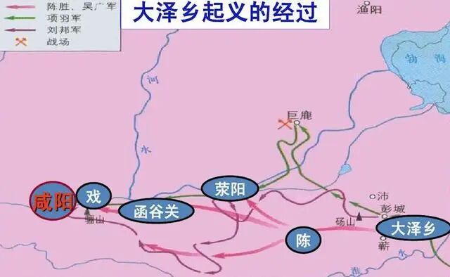 《史记》记载,二世元年(前209年)七月,陈胜吴广在大泽乡起义,表示:“今亡亦死,举大计亦死;等死,死国可乎?”从此踏上反秦的道路,而轰轰烈烈的反秦大戏也从此拉开。