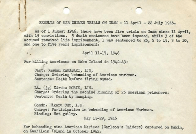 1946年1月1日,在堀江芳孝陆军少佐的协助下,参与食人事件的相关军官被美军全部逮捕,并在关岛成立了负责搜集证据的调查委员会,和负责审判的战犯委员会。