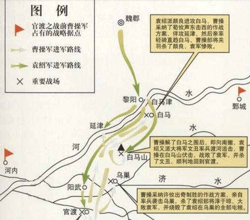 战争后期,曹操派军奇袭袁绍的屯粮地乌巢(今河南新乡延津东南),一把红果果的大火把袁绍的军粮烧的一干二净。饿肚子的袁绍军自然无法继续作战,大军崩溃。袁绍仓皇带八百骑兵退回河北,曹军先后歼灭袁军数万余人。