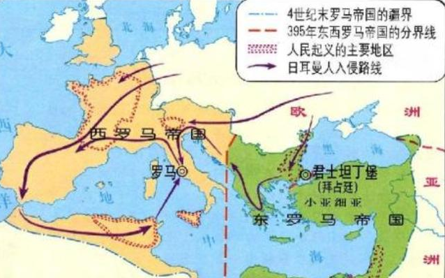 393年狄奥多西一世宣布基督教为国教,废除多神教,停止古代奥运会。第二年,狄奥多西一世完成罗马的统一,这是罗马帝国的最后一次统一。395年,狄奥多西一世去世后将罗马帝国分给自己的两个儿子,永久分治,是谓西罗马帝国和东罗马帝国,西罗马帝国以罗马城为首都,东罗马以君士坦丁堡为首都。