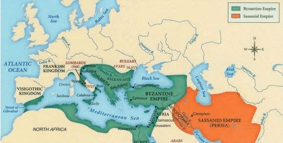 七世纪初,亚洲西部地区分属于两个强大的帝国:拜占庭与萨珊波斯。两国沿美索不达米亚平原东西并立。其中的萨珊波斯,不仅占据了印度洋沿岸的大部分地区,甚至跨越波斯湾,一度占领了今天阿拉伯半岛上的也门地区,势力空前强大。拜占庭帝国继承了罗马帝国的名号,自然不会在近东地区退缩半步。由此,萨珊波斯与东罗马在5——6世纪之间战争不断,双方围绕两河流域展开了连绵不休的战争。