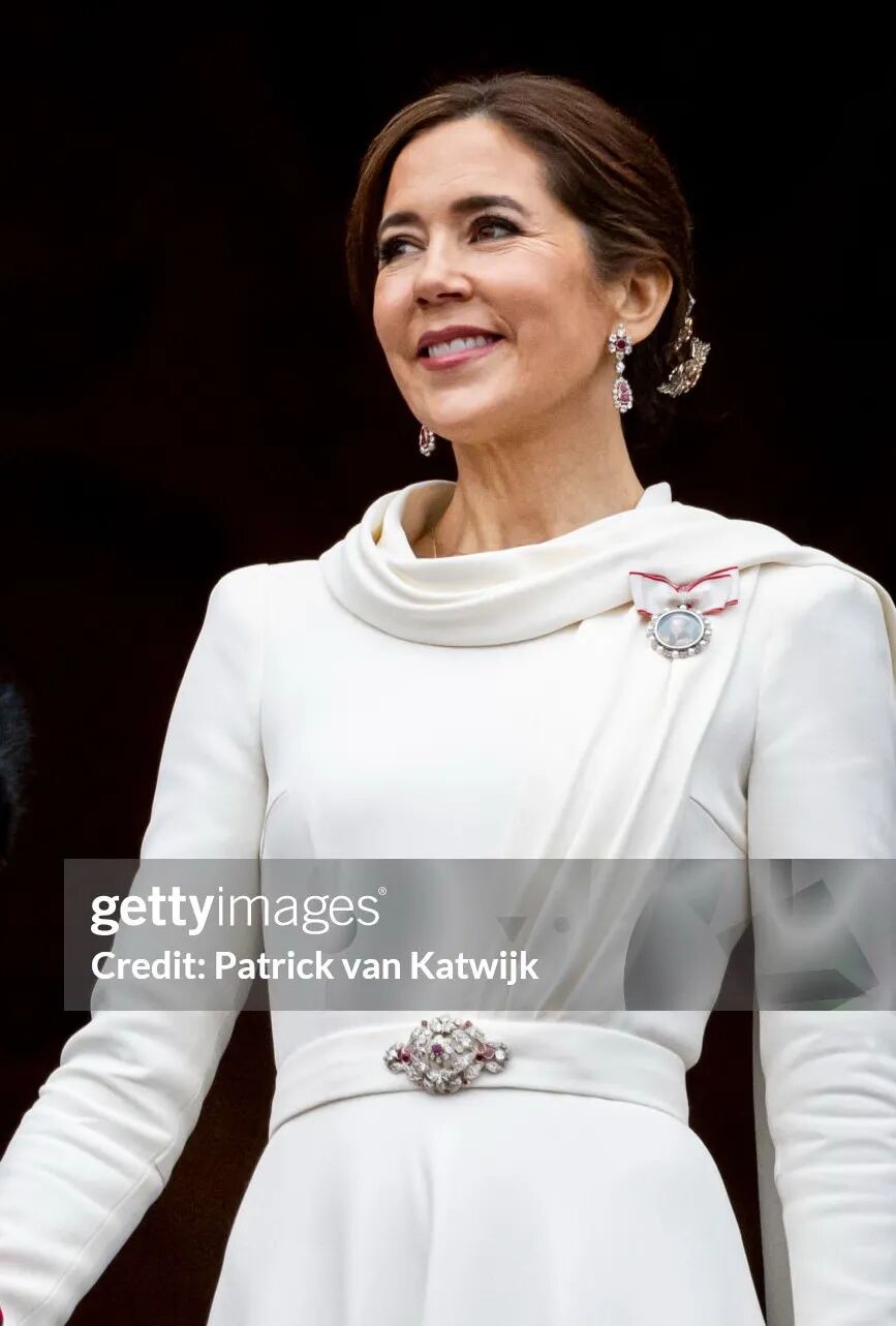 玛丽的披风式白裙子由本土设计师SØREN LE SCHMIDT定制,款式各方面都很得体,搭配红葡萄套装的耳环胸针头饰就是国旗色