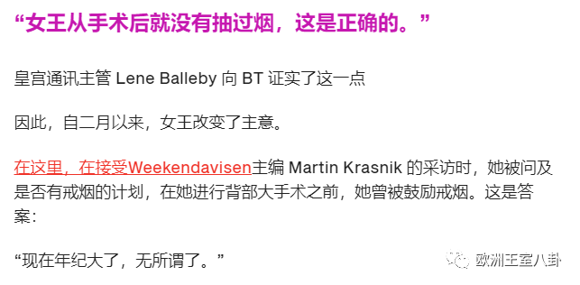 看外网论坛,她老同事荷兰前女王碧翠丝也是老烟鬼,但她知道影响不好,基本都会躲着镜头抽。而玛格丽特的性子,显然是不太在乎