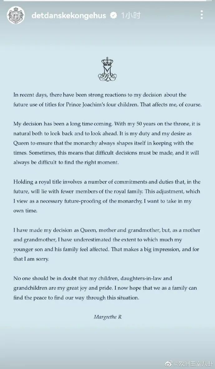 不知道大家还记不记得差不多就在1个月前,丹麦王室平地惊雷,宣布从明年1月1日起,二王子约克姆4个子女将失去王子和公主的头衔,只能挂着来自已故亨利克亲王法国娘家的蒙佩扎伯爵/女伯爵的头衔(滴!您的王子/公主体验卡即将到期,不可续费……)