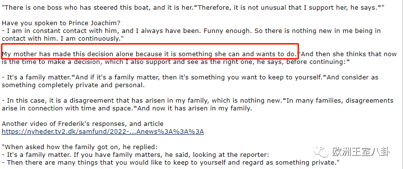 本来以为在本月初玛格丽特发声明道歉就算是结束了,万万没想到一直苟着没吭声的王储腓特烈也跟他老婆一样对着媒体叭叭叭说了一轮,行叭既然当事人全部都回应了就整一篇