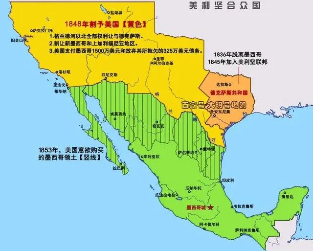 双方重订条约,墨西哥失去德克萨斯、新墨西哥、犹他、内华达、亚利桑那、加利福尼亚等230万平方公里土地。美国一跃成为地跨大西洋和太平洋的超级大国。