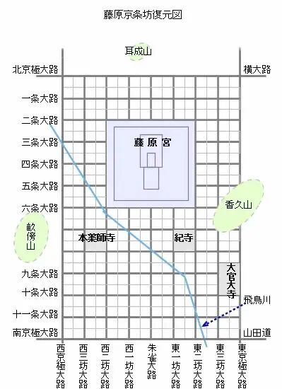 这座城市是模仿《周礼》中所说规划并建设的。它位于日本奈良县橿原市,被大和三山围绕。从迁都于此到元明天皇迁都平城京,共只持续了16年。但当初建造的时候,说要建一个永久性的大都城,可谓立了一个大大的flag。天武天皇学习了中国长安的条坊制后开始建造藤原京,但在完成前去世。皇后持统天皇于694年正式迁都到藤原京。藤原京在694到710年之间,成为持统、文武、元明三代天皇的都城。