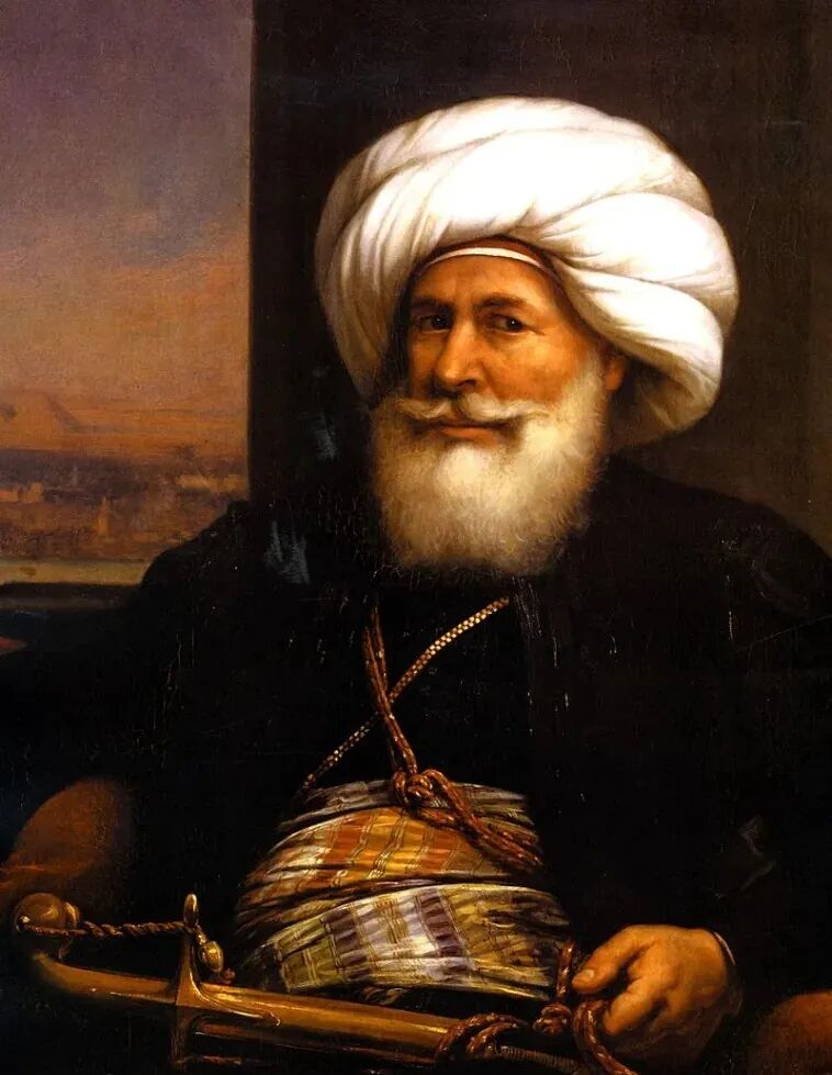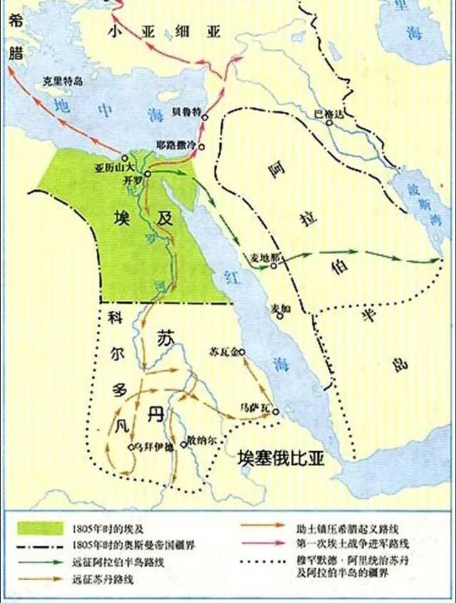 埃及阿里王朝,也称为穆罕默德·阿里王朝,起始于1805年,由奥斯曼帝国军中的阿尔巴尼亚裔军官穆罕默德·阿里(下图)建立。他成功地将埃及从奥斯曼帝国的边缘地带转变为地区性强国,并企图以此为基础,构建一个庞大的王国,以取代正在衰落的奥斯曼帝国。