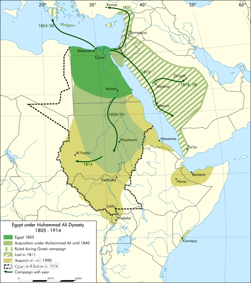 阿里王朝在19世纪30年代达到了顶峰,当时阿里及其子易卜拉欣帕夏的势力范围远及幼发拉底河及底格里斯河。然而,大国的介入阻止了阿里进军君士坦丁堡的野心,使他的统治局限于非洲一隅。
