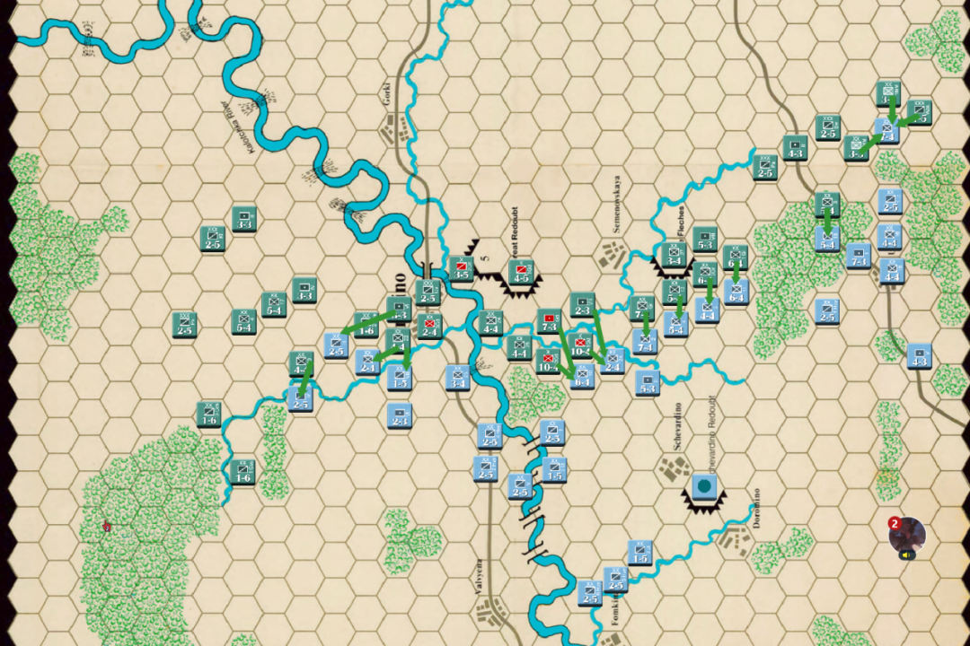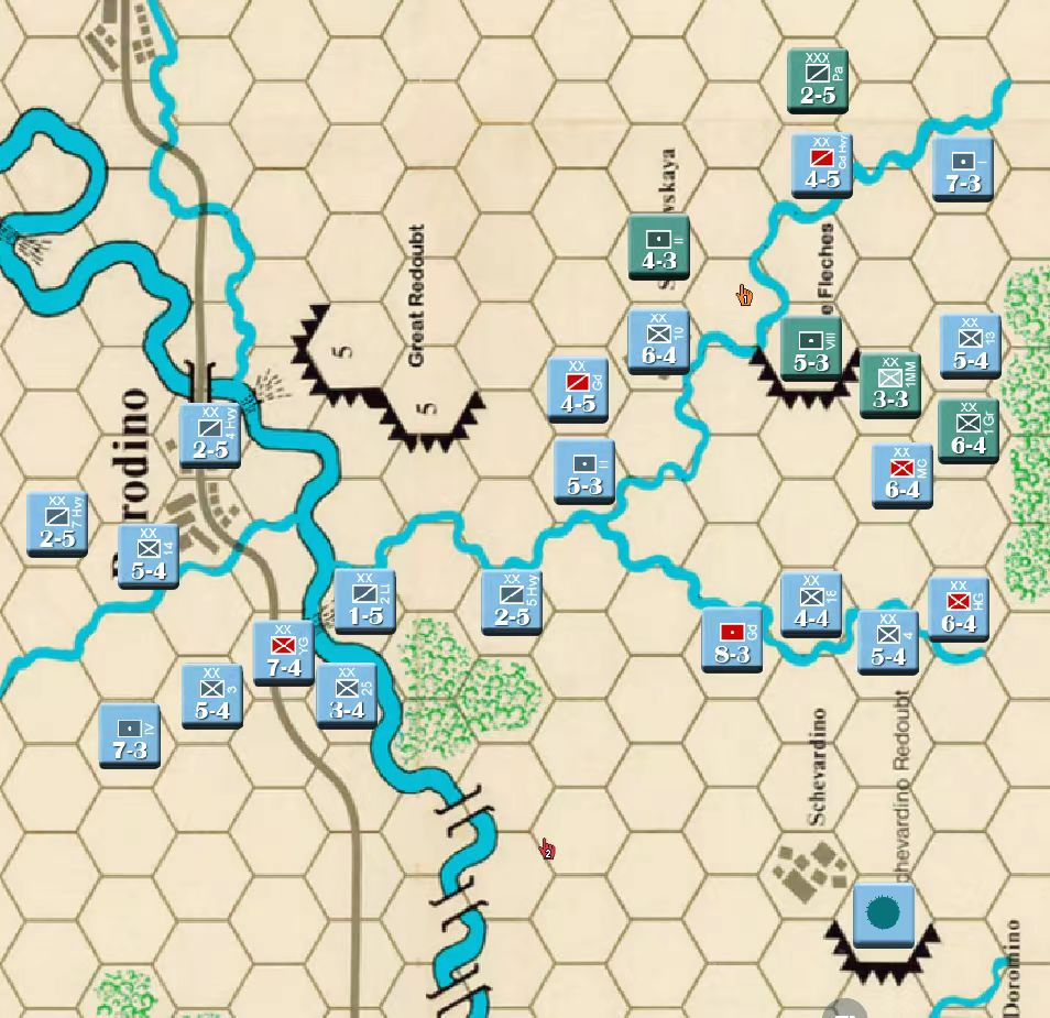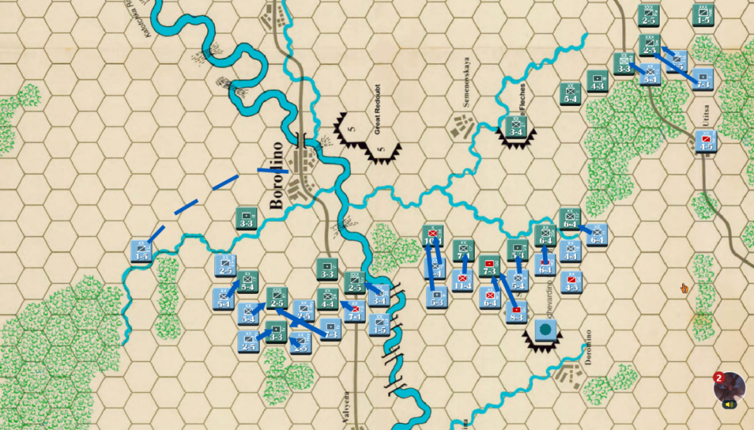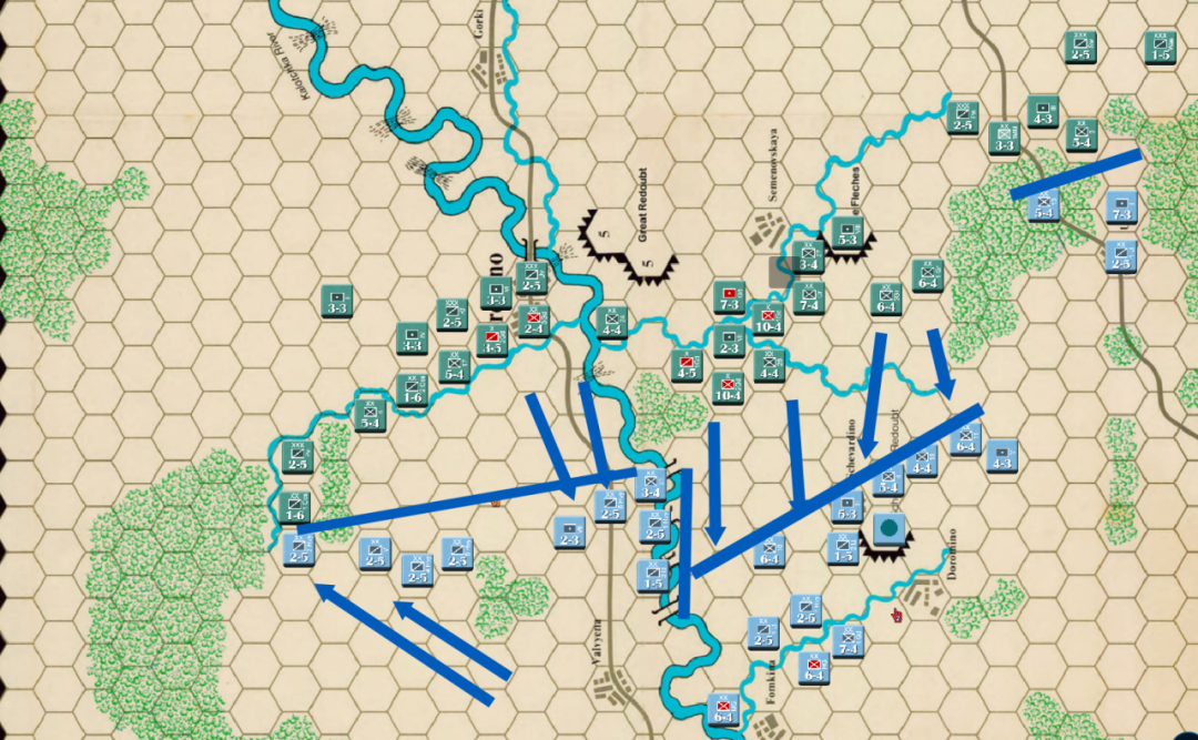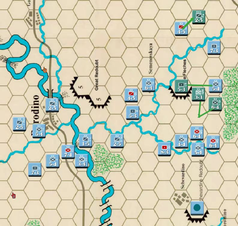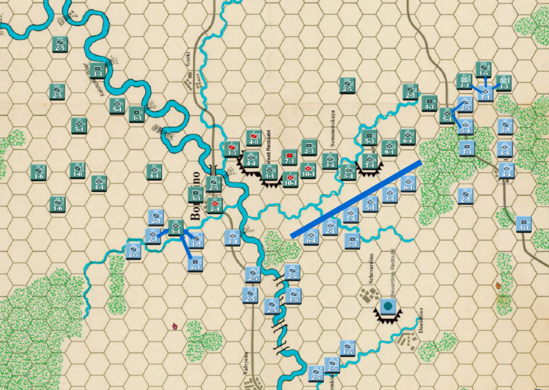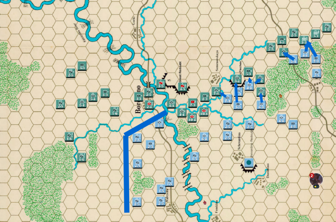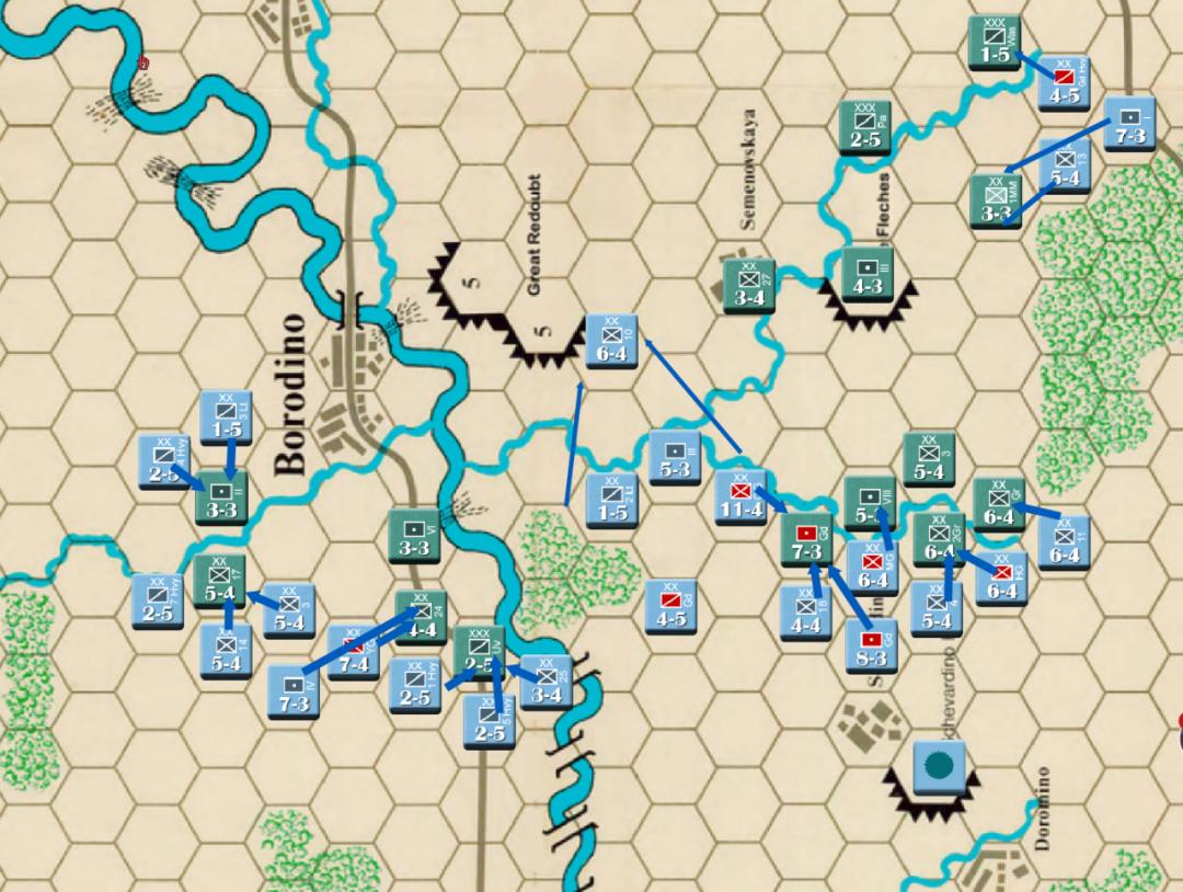 此时战局已经明显不利,法军玩家决定撤退,通过大踏步的撤退以空间换取时间,争取在增援到来前尽可能稳住战线,左翼俄军虽多但是战力比较弱,因此通过骑兵封住哥萨克的通道防止其包抄,而左翼战力较高的单位被派去守住桥梁防止俄军主力进入左翼屠幼(后来的发展证明这个策略十分有效)中线各单位向舍瓦尔季诺村撤退并与当前敌军保持一个回合的距离,准备依托村落组织防御坚持到青年近卫军、黑森近卫军和中年近卫军接手防御。