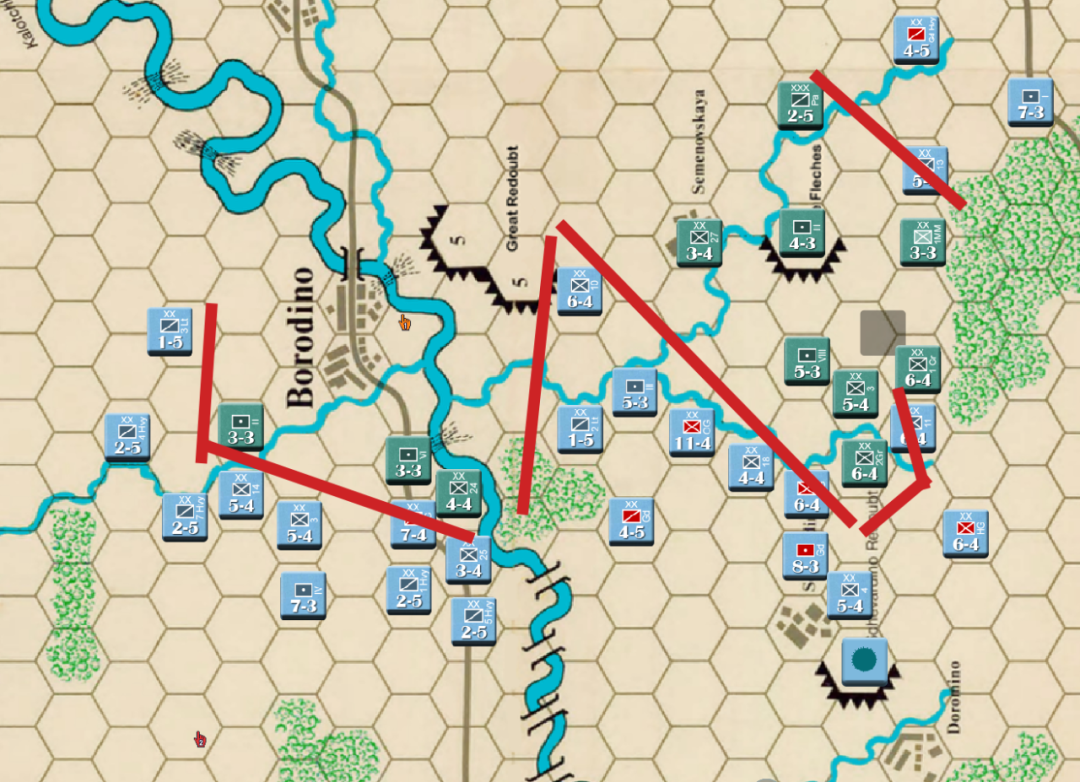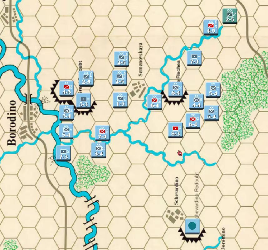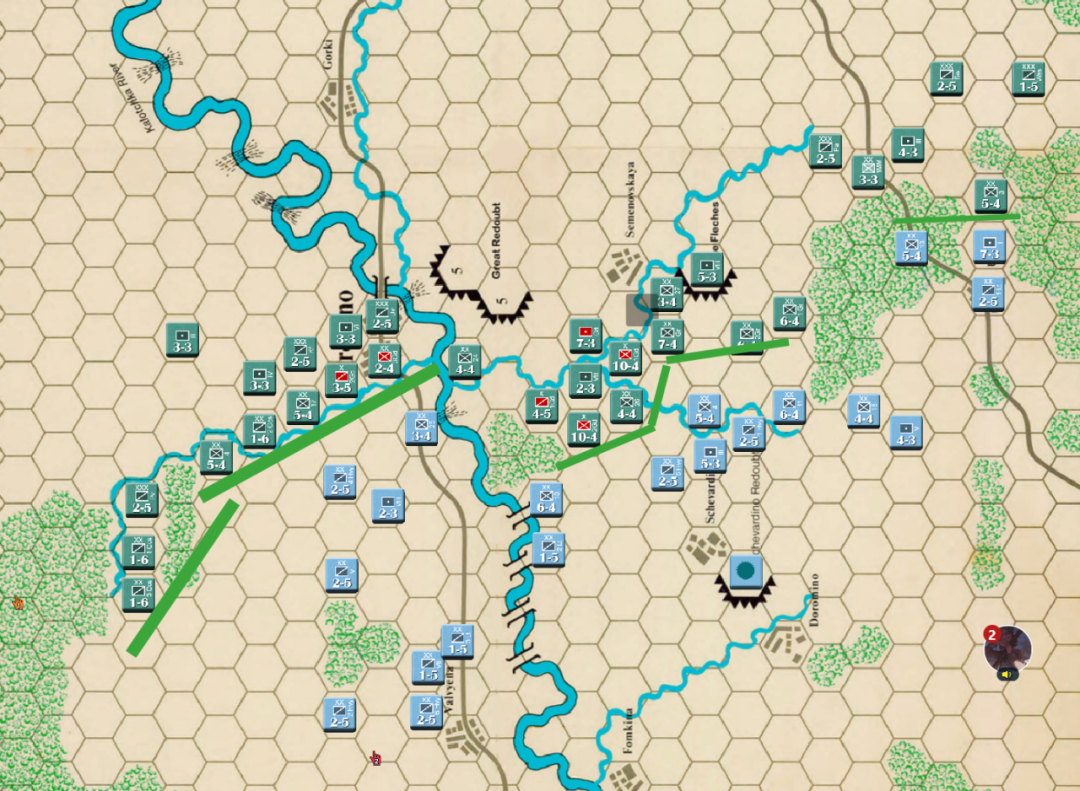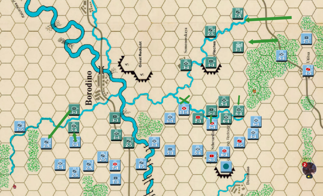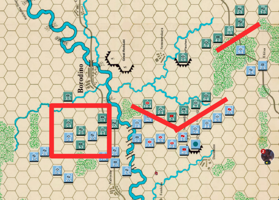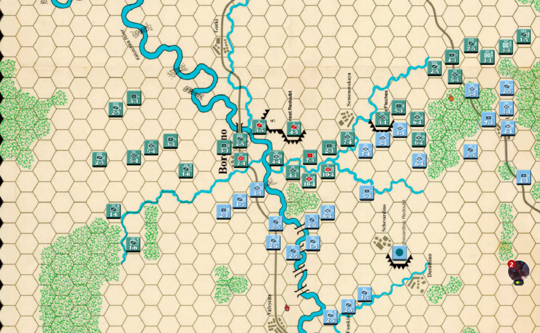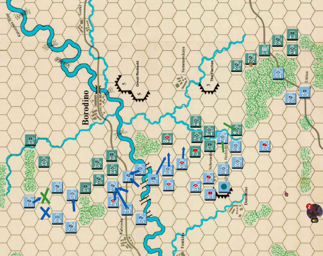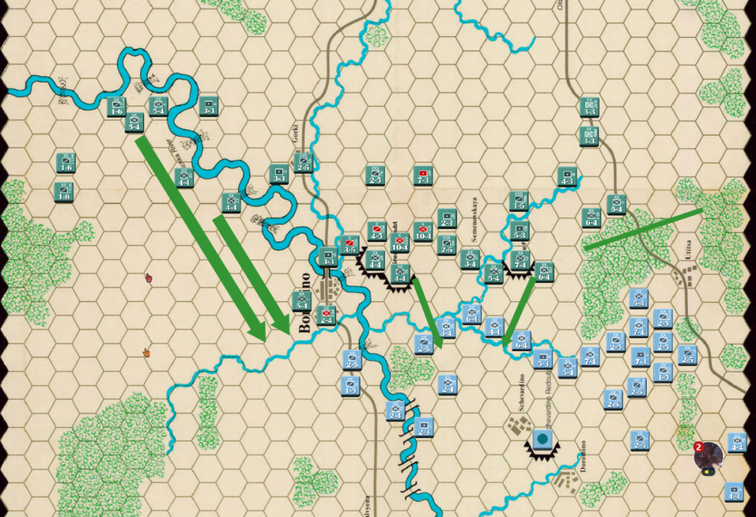 此时战局已经明显不利,法军玩家决定撤退,通过大踏步的撤退以空间换取时间,争取在增援到来前尽可能稳住战线,左翼俄军虽多但是战力比较弱,因此通过骑兵封住哥萨克的通道防止其包抄,而左翼战力较高的单位被派去守住桥梁防止俄军主力进入左翼屠幼(后来的发展证明这个策略十分有效)中线各单位向舍瓦尔季诺村撤退并与当前敌军保持一个回合的距离,准备依托村落组织防御坚持到青年近卫军、黑森近卫军和中年近卫军接手防御。