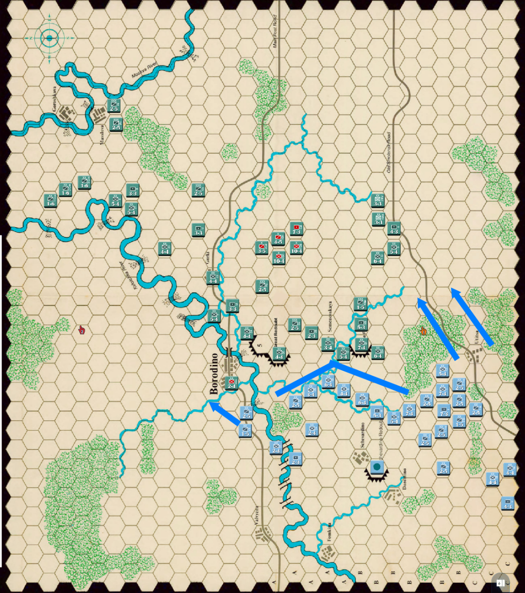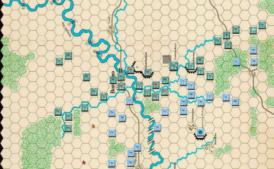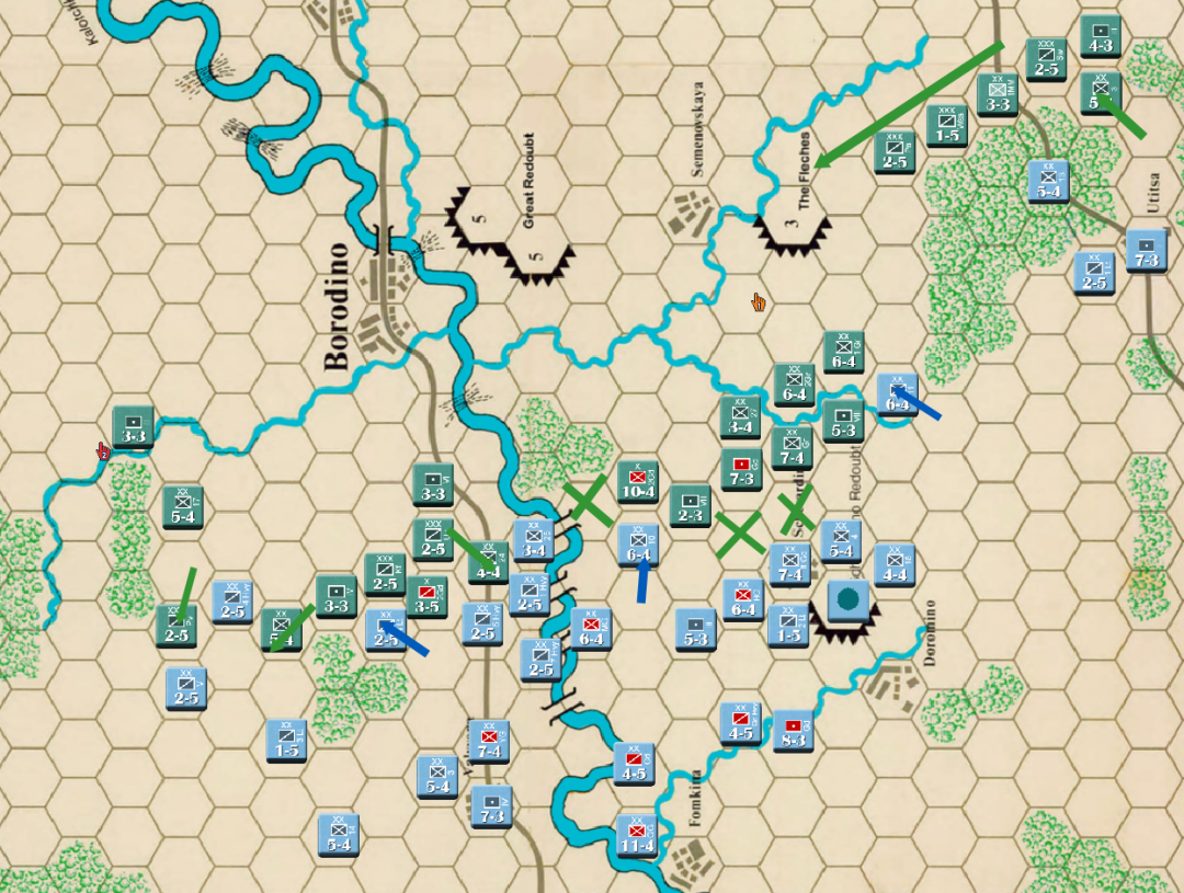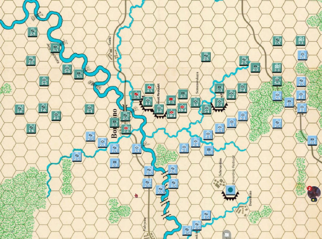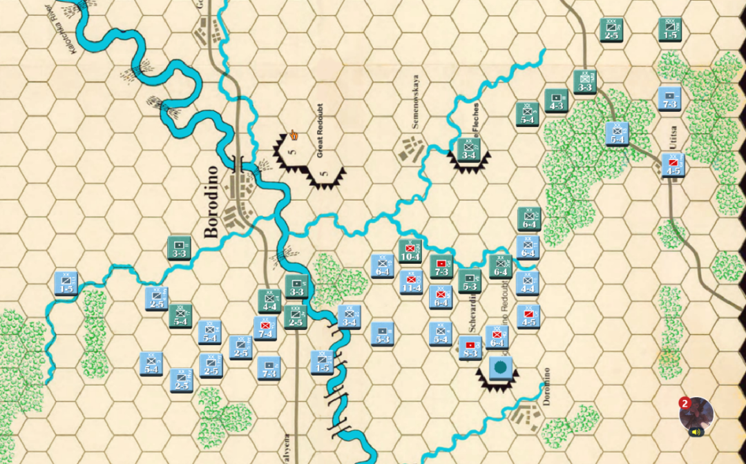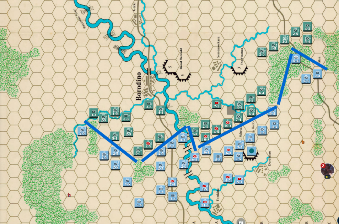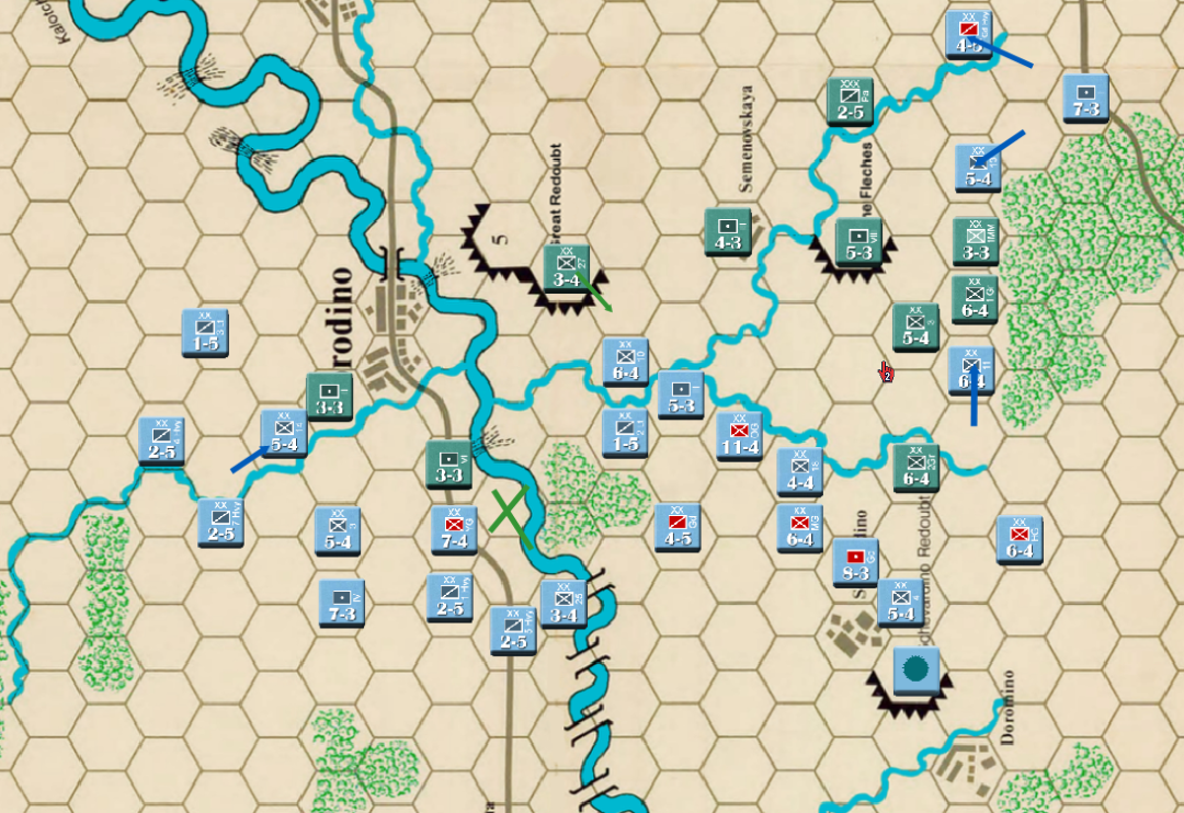 此时战局已经明显不利,法军玩家决定撤退,通过大踏步的撤退以空间换取时间,争取在增援到来前尽可能稳住战线,左翼俄军虽多但是战力比较弱,因此通过骑兵封住哥萨克的通道防止其包抄,而左翼战力较高的单位被派去守住桥梁防止俄军主力进入左翼屠幼(后来的发展证明这个策略十分有效)中线各单位向舍瓦尔季诺村撤退并与当前敌军保持一个回合的距离,准备依托村落组织防御坚持到青年近卫军、黑森近卫军和中年近卫军接手防御。