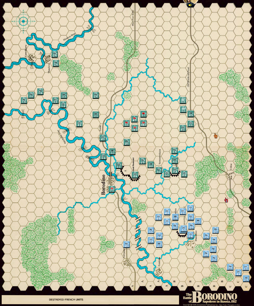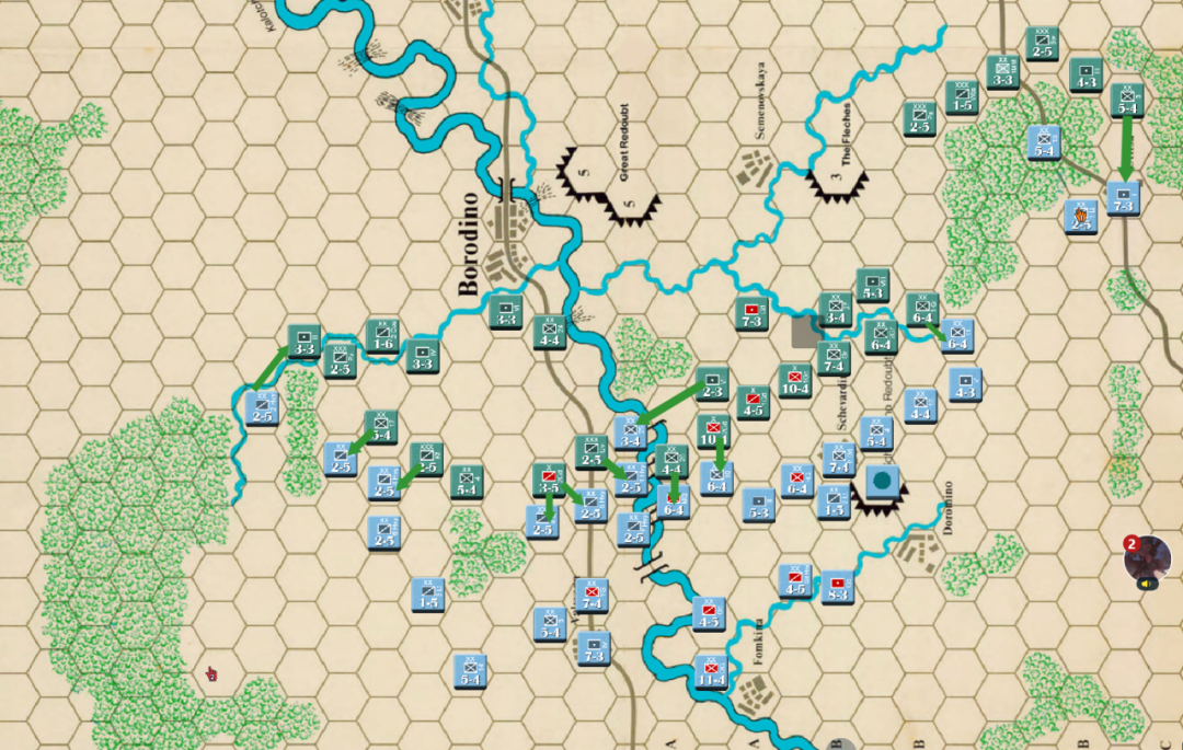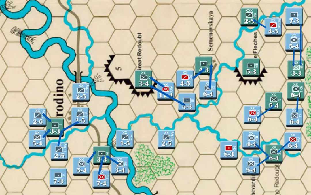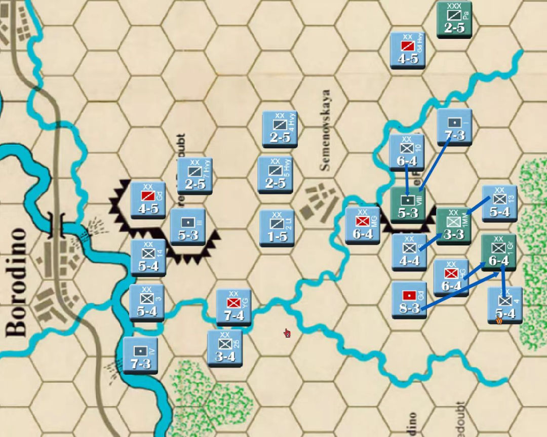 由于法军的大踏步撤退俄军暂缓了攻势等待后续部队上来,而此时以老近卫军为代表的法军精锐已经进场了,因此第五回合的俄军行动阶段和第六回合的法军行动阶段都没有发起大的进攻。(当然我也忘了截图)