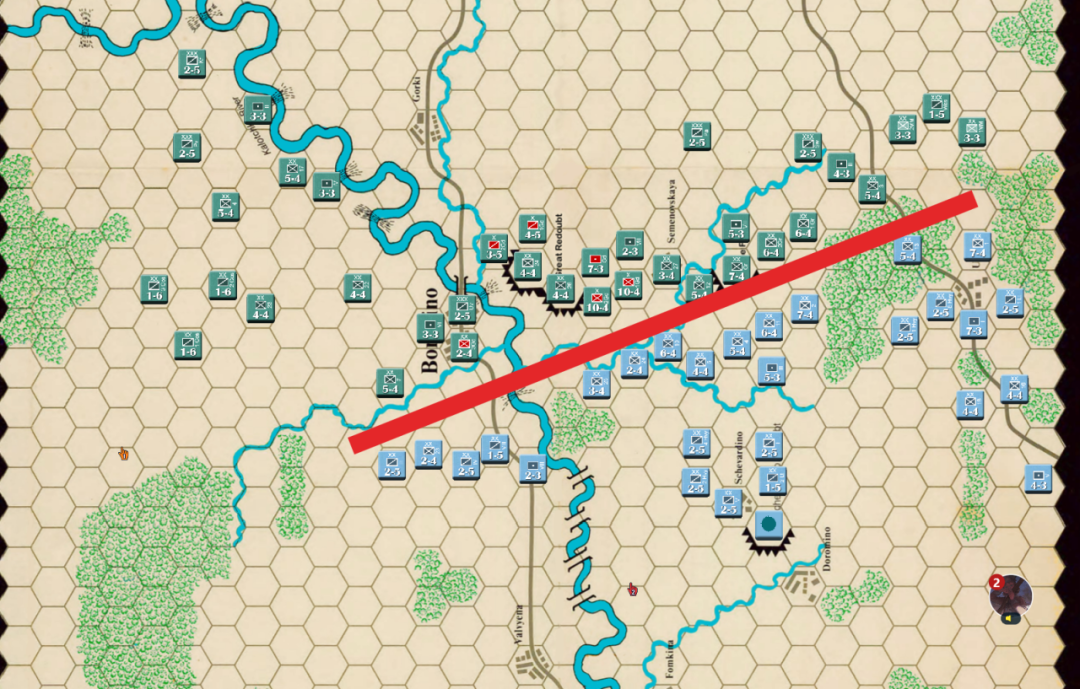 对两军来说森林地区是会战的关键,只要正面防御得当,右翼依托河流与博罗季诺村节节抵抗,俄军的防御重点其实仅有一处,加上近卫军的全面出击其实守住基本有很大把握,然而对胜利条件把握的不清晰是俄军玩家此次失败的关键。