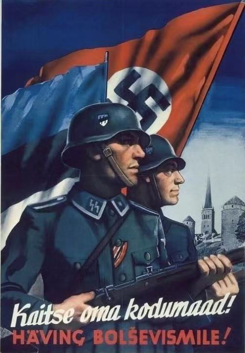 ▲党卫军在爱沙尼亚的征兵海报,上面用德语和爱沙尼亚语书写着“保卫你的家园”
