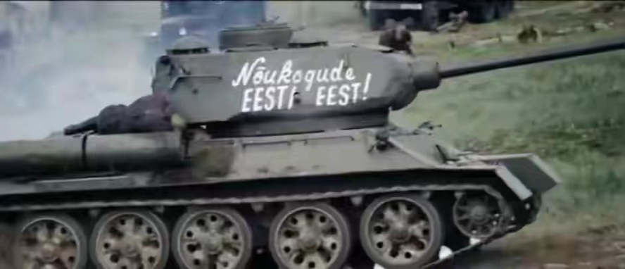 ▲《我们的1944》中的苏军坦克,喷涂着爱沙尼亚文标语“为了爱沙尼亚人民的苏维埃”