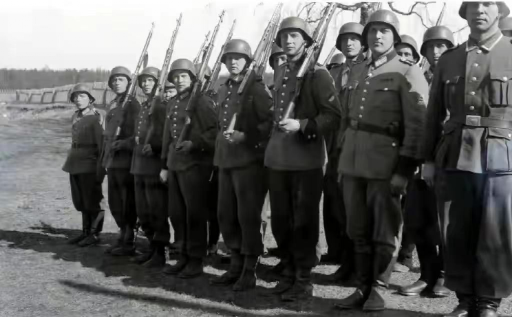 ▲一队身着德军制服的爱沙尼亚保安部队,虽然归德军指挥,但从他们身上没有纳粹标志可以看出来他们并不属于德国正规军