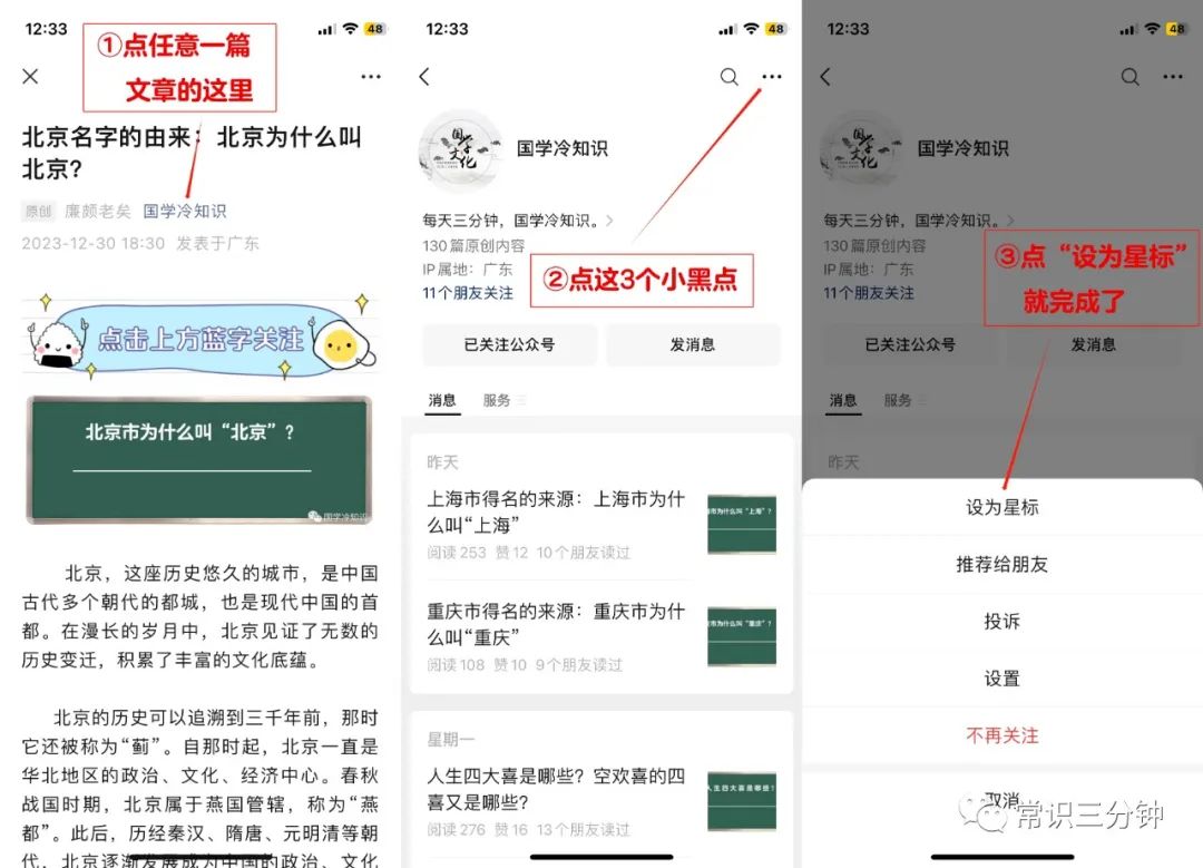 最近,有很多朋友在后台问我,为什么我们的推文总是神出鬼没的,有时候能看到,有时候看不到? 其实,这是因为订阅号改变了推荐规则,想不错过我们的每天好文,请大家一定一定一定要星标我们,这样你就可以在茫茫人海中,一眼就看到我们啦! 下面就是设置星标的步骤(可以点开图片,放大来看),只需简单3步,动动您发财的小手指就行。 |