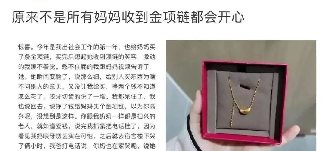 我心怀期待地将精心挑选的金项链送到母亲手上,却迎来了出乎意料的冷漠和不满。