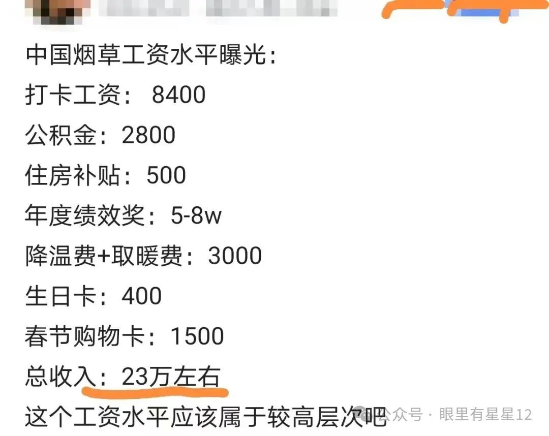 虽然这位烟草公司员工的收入已经相当可观,但许多网友却觉得这还是“太少”。中国烟草公司对员工的福利保障始终是人们关注的话题。根据2024年的数据分析,这家公司在员工福利方面的表现非常出色。他们为员工提供了相对较高的薪资待遇。根据统计,2024年中国城镇非私营单位的在岗职工平均年薪为128,000元,但烟草公司的员工月薪已经超过8000元,年薪达到10万左右,这一数字显然高于大多数职业的平均工资。这充分体现了烟草公司对员工薪酬待遇的高度重视。