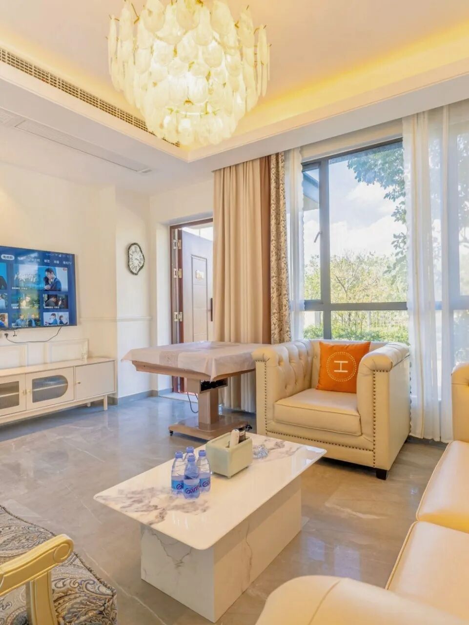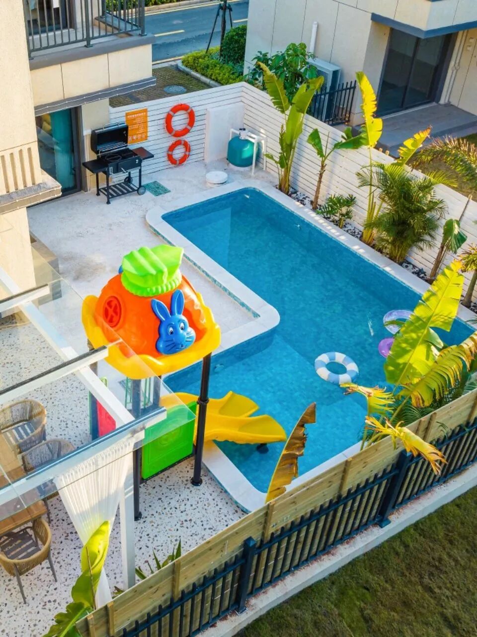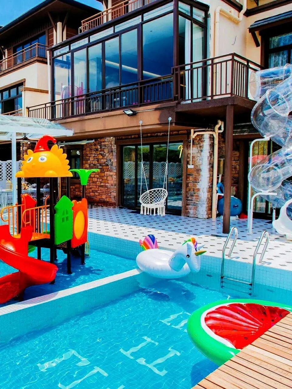 一楼的后花园🈶小型水上乐园和私家暖水泡池,乐园分戏水区和游泳区🏊🏻,足不出户就能感受夏天清凉的快乐,简直是一家人的度假天堂🥰而且还配有多功能厨房、电烧烤机🥓、KTV、麻将,在花园泳池边烧烤赏月太惬意了🤩,客厅还有火烈鸟泡泡池和梦幻旋转木马🎠,童心爆棚!