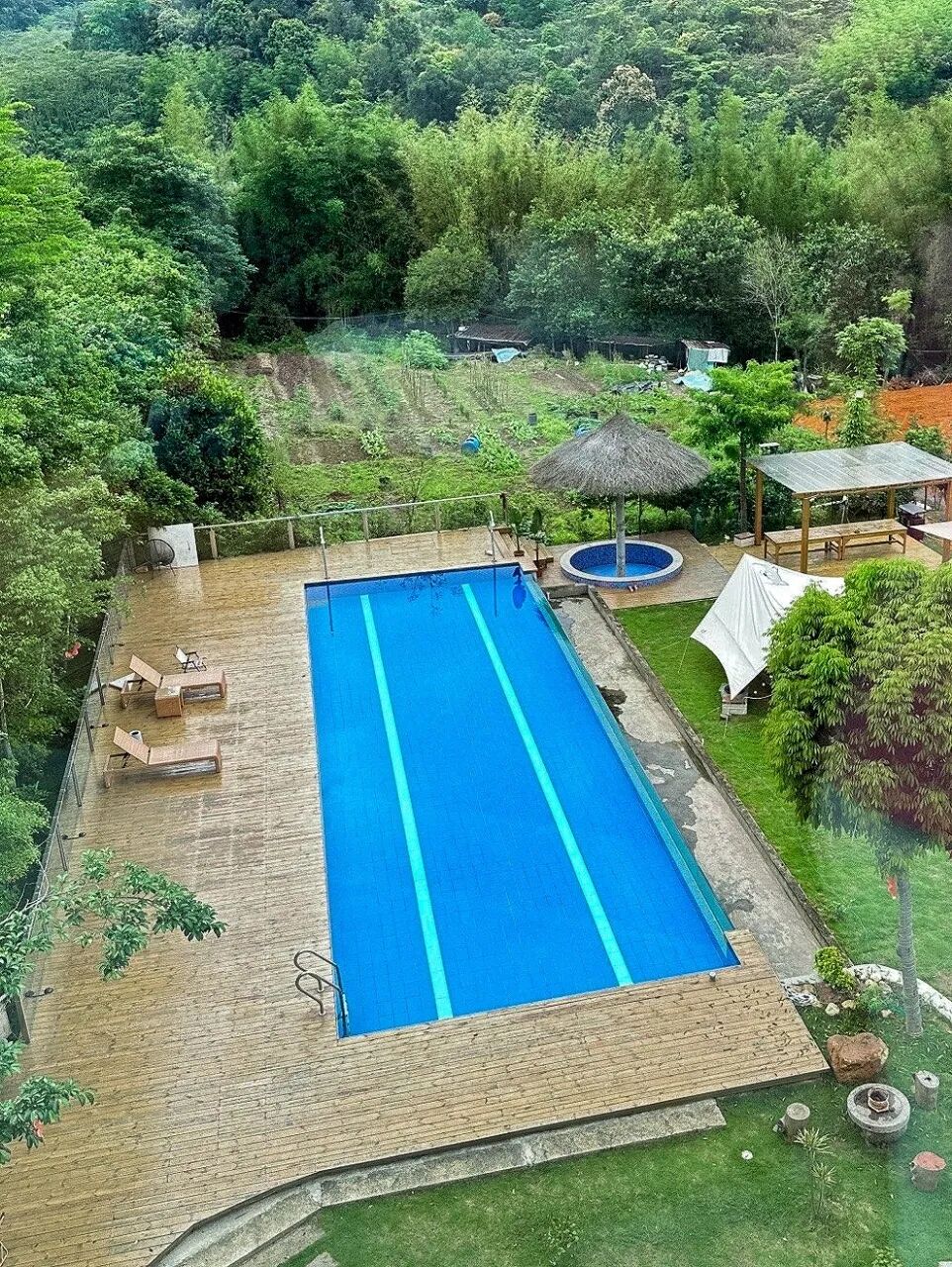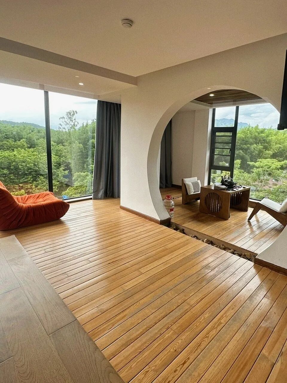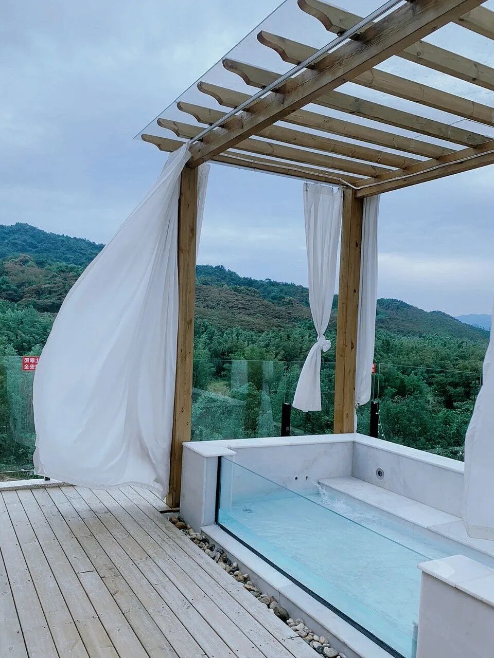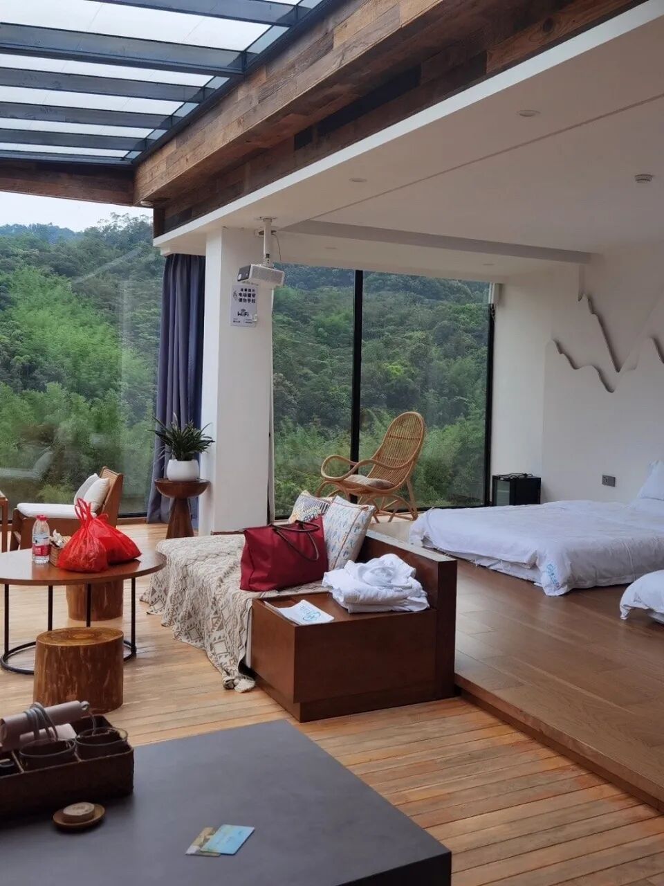 房间一百多平270°立地玻璃超大平层🏞无敌景观,带泡池🏖还有麻将桌🀄一楼花园还有超出片玻璃泳池🏊草地上自带天幕桌椅🎥宝们可以自带野餐和 BBQ 食材体验时下最流行的露营🏕哦!