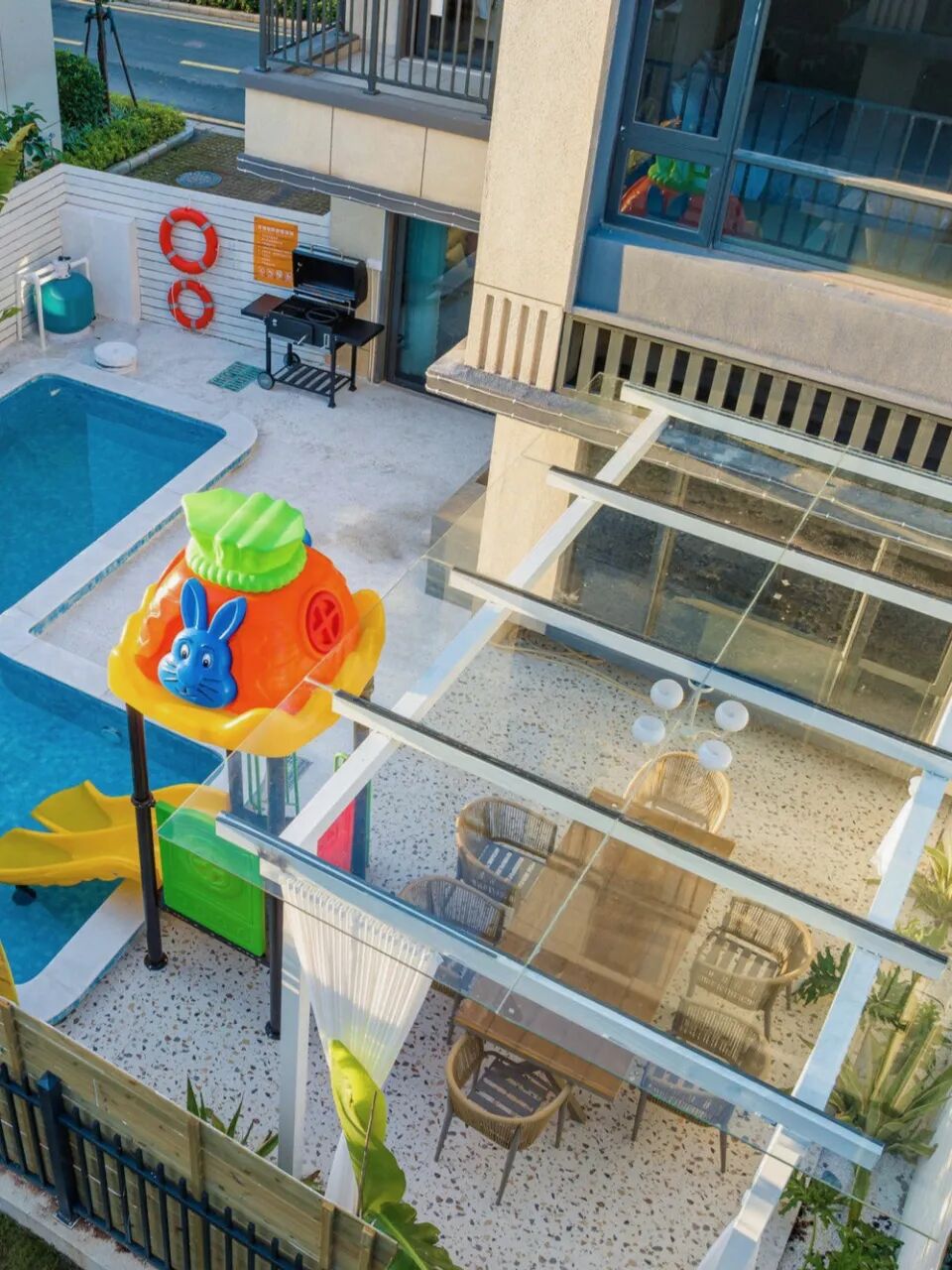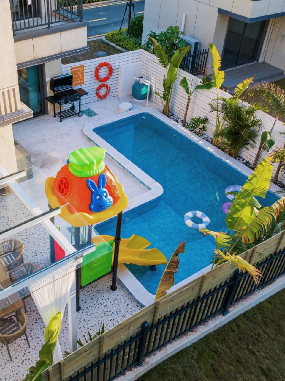 ✅亲子游✅家庭游✅秋日好去处📍地点:佛山美的鹭湖度假区🏠房型:3️⃣房5️⃣床🌈别墅亮点🔹花园滑滑梯泳池🛝,足不出户就享受清凉💦,超大泳池,大人小孩都能享受快乐✨🔹烧烤BBQ🍗➕麻将🀄️➕KTV🎤,一天玩耍下来,晚上能够吃点烧烤,搓两把麻将,再唱两首歌曲,这生活别太惬意🤣