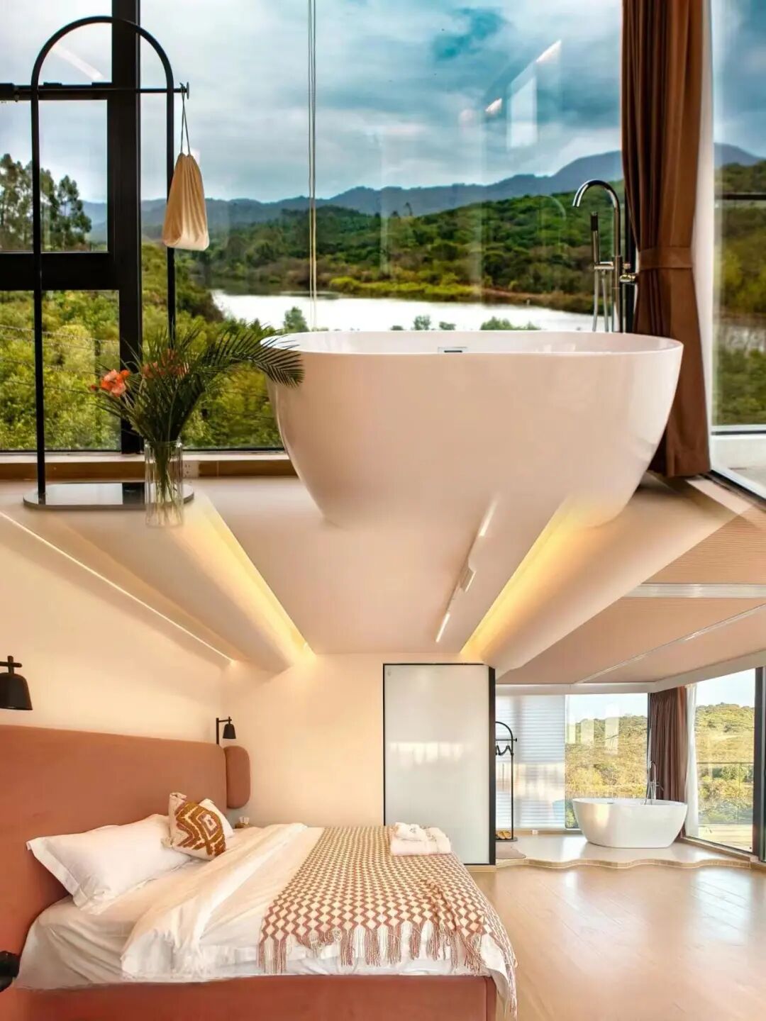 ·😆山水私汤、镜面水系、无边景观山野泡池、让山居生活变得更加主盈,巨大落地窗、房间舒适大气、都使得客人能够更好地亲近自然山野美学空间极简之美也随处可见
