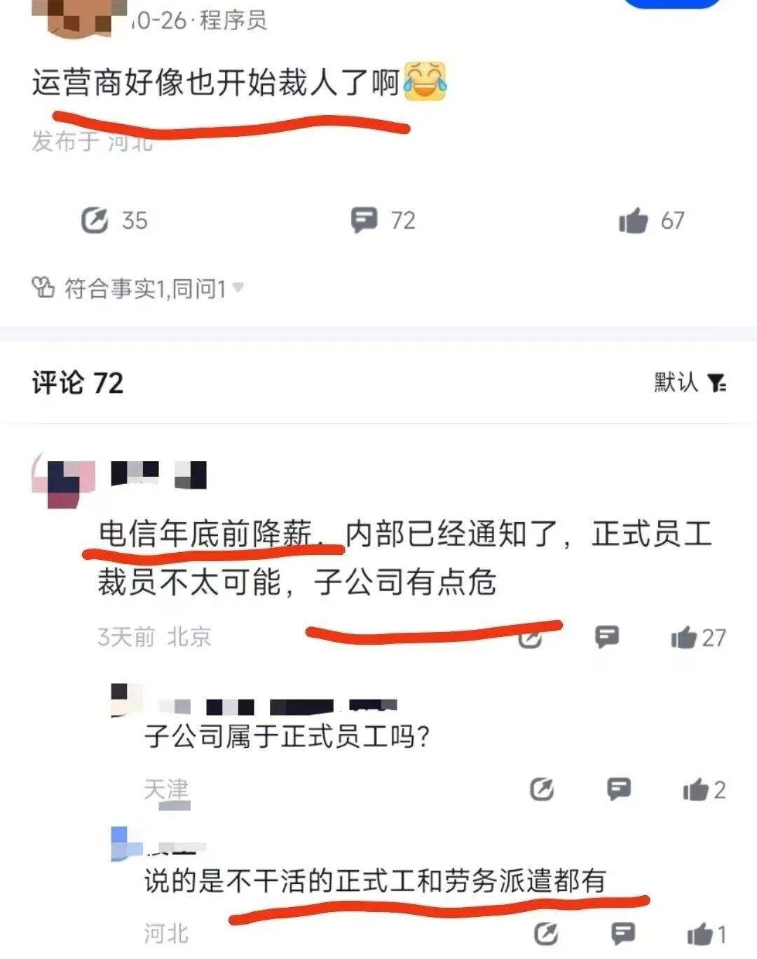 另一网友爆料:电信行业裁员浪潮正愈演愈烈,去年某地区已有300多名电信员工被裁,而今年还会再裁100多人!这一消息让许多人深感意外。一直以来,电信行业被视为高稳定、高福利的“金饭碗”,吸引了大批优秀人才。然而,随着市场竞争加剧、技术更新换代等因素的影响,电信行业也不得不面临巨大的变革压力。