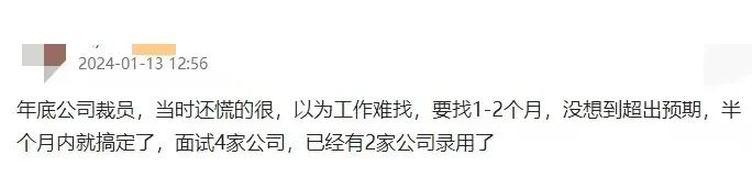 他说:年底裁员之际,曾一度担忧找工作的不易,以为需要花费1-2个月的时间寻找新机会。然而,结果出乎预料,只用了半个月的时间,我就顺利地完成了求职的过程。在这期间,参加了4家公司的面试,并已获得其中2家公司的录用通知,结果令人满意。