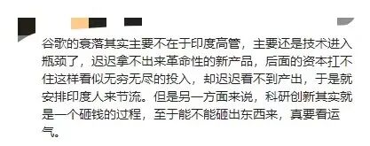 有网友爆料:如今的谷歌领导层缺乏前瞻性,而问题并非局限于某个部门,而是从高管团队到高级副总裁,再到中层领导,都表现出目光短浅和思维空洞的现象。
