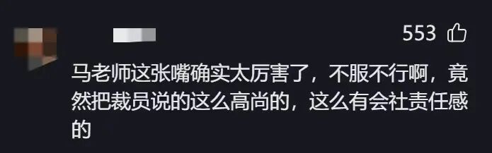 有网友笑称,马老师这张嘴确实太厉害了,不服不行啊,竟然把裁员说的这么高尚的,这么有社会责任感的。