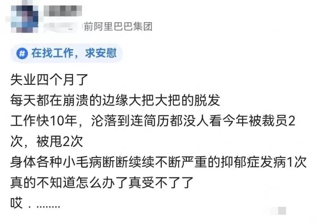 也有网友讲述了自己失业的现状,失业4个月,每天都在大把脱发,工作十年被裁员,如今简历都没人看,自己的身体也不断出现小毛病,真不知道怎么办才好了。