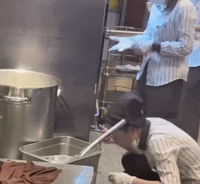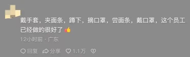 还有网友点评了员工的做事细节:戴手套,夹面条,蹲下,摘口罩,尝面条,戴口罩,这个员工已经做得很好了。