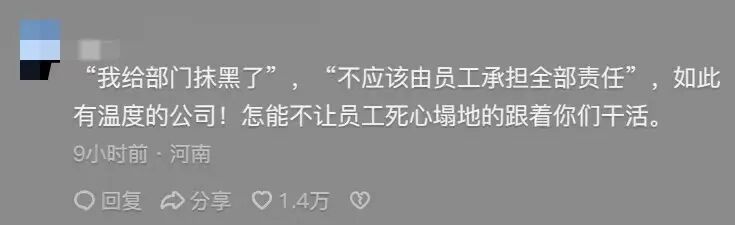 另一名网友说:“不应该由员工承担全部责任”,如此有温度的公司!怎能不让员工死心塌地地跟着你们干活。