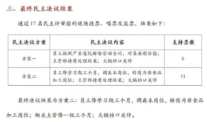 最终方案二以11票胜出:员工降学习期三个月,调离本岗位,转岗为非食品加工岗位;相关主管降一级三个月;火锅档口关停。