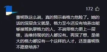 对于董明珠的公开回应,网友坦言,董明珠的这番言论无疑在暗示格力当前面临的严峻形势,格力缺乏能够胜任未来领导角色的人才。