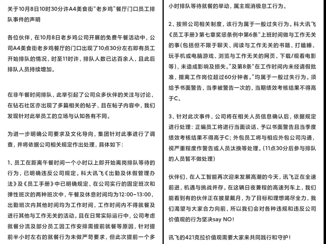 这也解释了,为什么科大讯飞的员工敢光明正大地提前一个半小时离岗了,以及科大讯飞在事情发生一周之后才出具处罚通报。