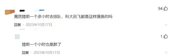 有网友表示:竟然提前一个多小时去排队,科大讯飞都是这样摸鱼的吗?另一位网友跟帖,提前一个小时,也是醉了。