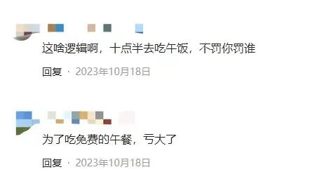 也有网友说:十点半去吃午饭,不罚你罚谁;为了吃免费的午餐,亏大了。